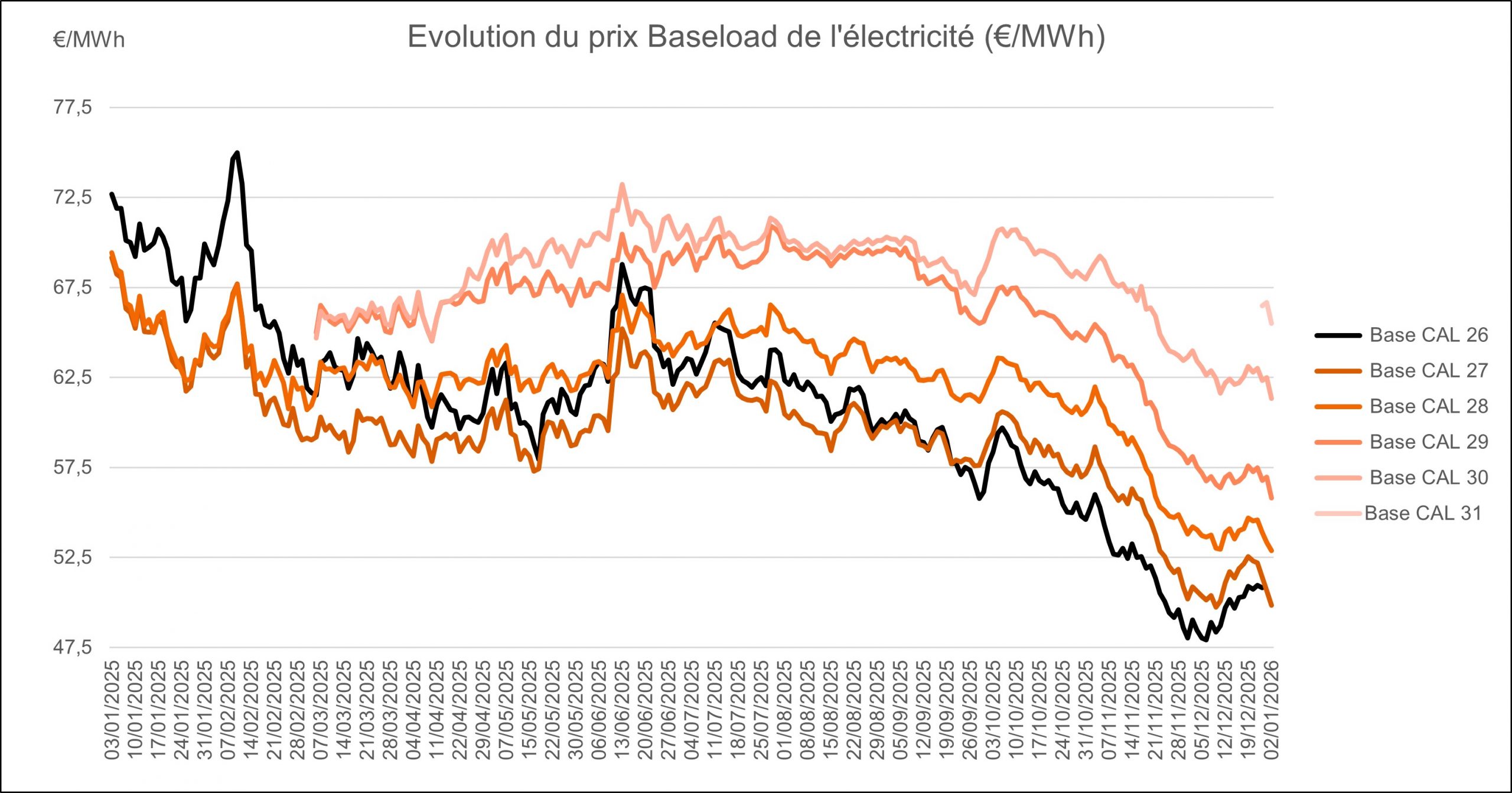 Prix de l’électricité France baseload (bandeau 24/24) pour la livraison sur les années 2026 à 2031.